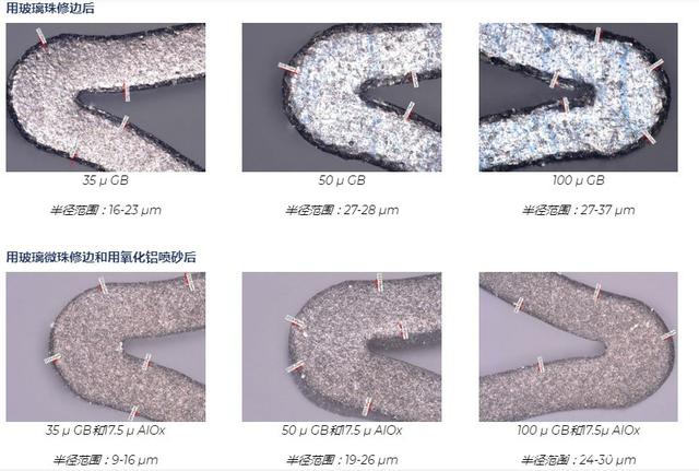 經(jīng)過吉川公司工藝工程師測(cè)試,用氧化鋁砂進(jìn)行定向的噴砂處理可以去除氧化層,平滑表面缺陷并改善外圍支架的表面質(zhì)量。支架的受損區(qū)域很脆,但基礎(chǔ)材料鎳鈦諾卻具有延展性。氧化鋁噴砂磨料使用去氧化層,并且對(duì)韌性基體的侵蝕最小,從而在支架撐桿的整個(gè)長度上形成均勻的表面光潔度。 市場(chǎng)最新的支架設(shè)計(jì)和醫(yī)療植入物要求更大的邊緣倒圓角。圓形邊緣降低了被植入物卡住,其他風(fēng)險(xiǎn)的可能性。氧化鋁微噴丸的半徑為5-15 m,但新的幾何尺寸指定為接近25 m。該半徑可以通過三種途徑實(shí)現(xiàn):延長噴砂周期,使用更大尺寸的氧化鋁或完全使用其他磨料。通過測(cè)試,我們了解到更長的噴砂周期可以去除更多的團(tuán)塊,而較大尺寸的氧化鋁會(huì)產(chǎn)生過于粗糙而無法拋光的表面。畢竟,氧化鋁顆粒的形狀為塊狀,邊緣稍尖。這給了我們一個(gè)可行的選擇:嘗試使用其他類型的磨料。為了克服這一障礙,我們測(cè)試了幾種類型的介質(zhì),發(fā)現(xiàn)用玻璃珠噴砂可以在拐角處形成所需的半徑(最大30 m),而不會(huì)除去設(shè)備的額外質(zhì)量。結(jié)果是氧化鋁的質(zhì)量提高了十倍。經(jīng)過吉川公司工藝工程師的測(cè)試事實(shí)說明了結(jié)果的差異。用氧化鋁噴砂處理過的樣品的半徑僅為8-13 m,而用玻璃珠噴砂處理過的樣品的半徑為24-30 m。 經(jīng)過吉川公司工藝工程師最終測(cè)試事實(shí)證明,最好的心臟支架噴砂工藝需要用氧化鋁砂粗噴砂、再用玻璃珠微噴砂是目前最好的一種噴砂工藝方式。 經(jīng)過粗噴、微噴的產(chǎn)品外徑和內(nèi)徑轉(zhuǎn)角處的半徑可以實(shí)現(xiàn),而所需的附加材料去除最少。半徑的大小可以有效地控制,因?yàn)樗腔趫A形磨料,玻璃珠的大小和速度的??梢钥刂凭哂懈郊影霃降闹Ъ軈^(qū)域。通過機(jī)械加工表面,有助于保持支架的疲勞壽命。玻璃珠磨料通常用于必須保持嚴(yán)格公差的噴丸處理應(yīng)用中。玻璃珠對(duì)支架表面進(jìn)行噴丸處理,不會(huì)去除任何材料或數(shù)量可忽略不計(jì)的材料。如下所示,玻璃珠的尺寸很重要。玻璃珠的尺寸越大;邊緣越圓。玻璃珠有35 ,50 和100 兩種。讓我們看一下使用每種尺寸的樣本測(cè)試的結(jié)果。此處顯示的未噴砂的支架表面(500x)邊緣鋒利,并受到制造損壞。半徑范圍僅為3-8 m。為什么用兩種磨料處理比單獨(dú)用氧化鋁處理好? 玻璃珠無法消除制造過程中產(chǎn)生的浮渣,回彈和其他損壞;只有氧化鋁可以。氧化鋁不能產(chǎn)生真正的圓形邊緣。但是,它確實(shí)可以提供電拋光所需的理想表面光潔度。一個(gè)不能替代另一個(gè)。通過使用多步驟過程,植入物表面可以使用經(jīng)過驗(yàn)證的相同設(shè)備獲得兩全其美的效果。在該過程中添加第二種研磨劑聽起來可能需要更多的勞動(dòng)力,但實(shí)際上比其他修邊過程更有效。例如,電拋光可以產(chǎn)生較大的半徑,但它也會(huì)從整個(gè)零件中去除過多的材料,而不僅僅是角部,從而損害了支架的疲勞壽命。