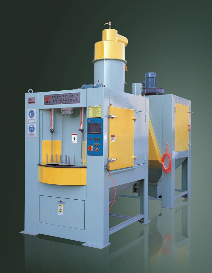 該機(jī)由主機(jī)、旋風(fēng)分離器、除塵箱、抽風(fēng)管道、空氣壓縮系統(tǒng)(客戶自備)、電氣系統(tǒng)等組成。本機(jī)配置12支普壓高速噴砂槍,根據(jù)工件的大小可擺動(dòng)噴砂,也可定點(diǎn)噴砂,靈活方便實(shí)用。
